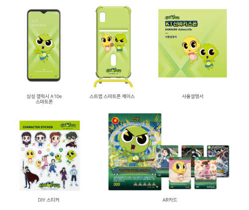 먼저 제품 구성으로는 삼성 갤럭시 A10e 본체, 스트랩 케이스, 사용설명서, AR카드 세트, DIY 스티커 세트를 제공합니다